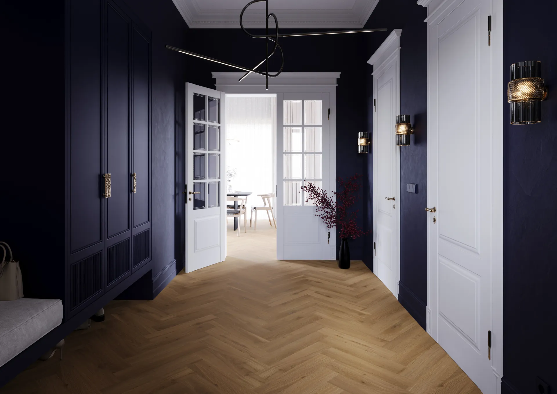 Royal Castle to podłoga, która łączy klasyczne piękno jodełki i naturalnego drewna z nowoczesną trwałością i praktycznością – idealna do wnętrz klasycznych, modern classic i współczesnych.