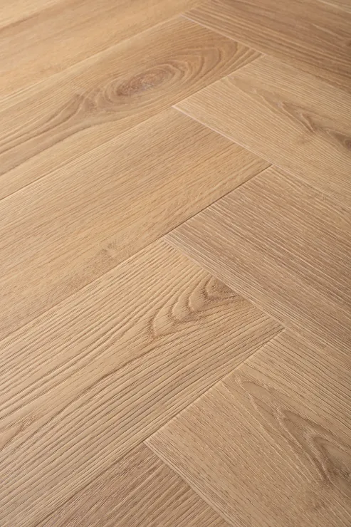 Louvre to dekor o jasnej, delikatnie kremowej tonacji, w której naturalne usłojenie drewna jest wyraźne, ale miękko zaznaczone, dzięki czemu powierzchnia prezentuje się świeżo i harmonijnie. Charakterystyczne, lekko zaoblone rysunki słojów dodają panelom autentycznego, drewnianego wyrazu, a spokojne różnicowanie odcieni nadaje kompozycji subtelną głębię. Układ jodełki porządkuje przestrzeń, tworząc elegancki, ponadczasowy rytm.