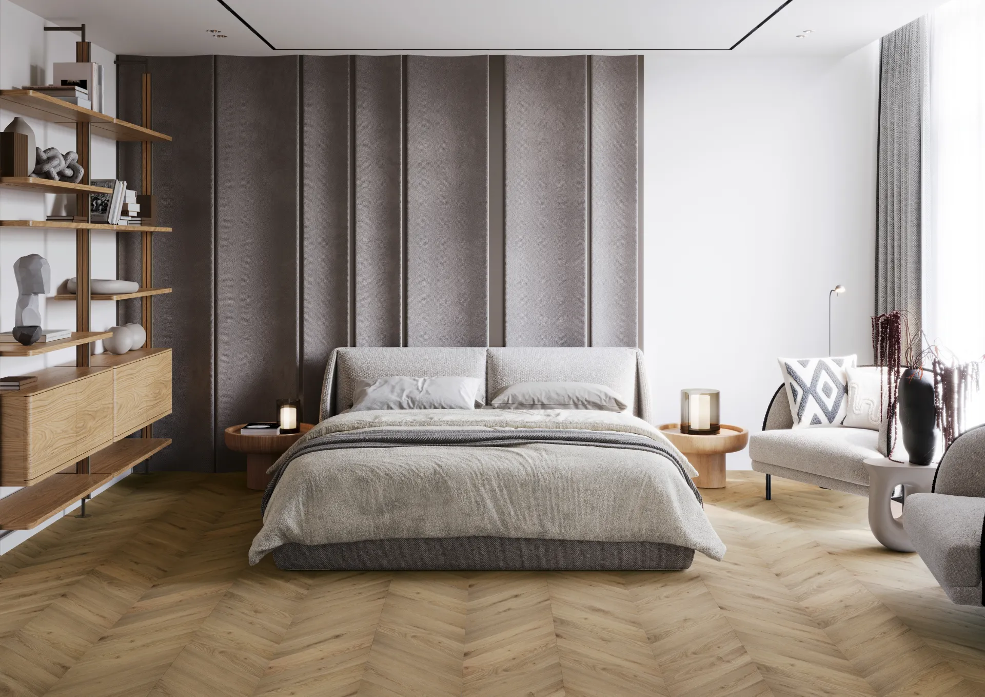Windsor to dekor utrzymany w jasnej, naturalnej tonacji dębu, która rozświetla wnętrze i nadaje mu lekkości oraz świeżości. Subtelne usłojenie, delikatne przejścia tonalne i matowe wykończenie tworzą powierzchnię o spokojnym, eleganckim charakterze, wiernie oddając wygląd naturalnego drewna. Kompozycja jodełki francuskiej porządkuje przestrzeń i wprowadza do niej harmonijny, ponadczasowy rytm, podkreślając architektoniczny charakter wnętrza.